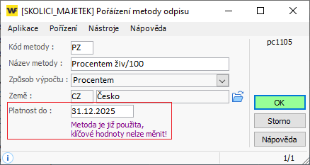 Životnost dle periody – Při zařazení majetku je nutné zadat jeho životnost podle zvolené periody, tzn. počet odpisů. Hlavní výhodou oproti procentním metodám, že počet odpisů (životnost majetku) je fixní a neměnný, i když provedete změnu ceny nebo technické zhodnocení majetku. To znamená, že změna odpisové ceny se promítne pouze do výše odpisů a neovlivní délku odepisování, datum posledního odpisu zůstane konstantní.