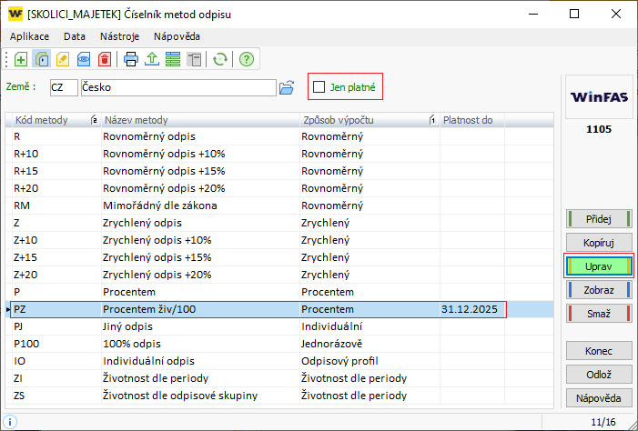 Pokud již nechcete některou z metod dále používat, můžete jí pomocí tlačítka Uprav nastavit hodnotu Platnost do. Metodu, která je již použita, totiž nelze smazat. Do zadaného data je možné metodu běžně používat, po tomto datu již nikoli.
