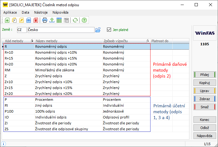 Číselník obsahuje přehled metod odpisování, které můžete v rámci modulu Majetek využít (rovnoměrné, zrychlené, životností, procentuální atd.). Lze v něm také zobrazit historii dříve používaných metod, jejichž platnost již byla ukončena. Tento číselník není jednotný a není centrálně spravován, takže záleží pouze na vás, jaké metody bude obsahovat.