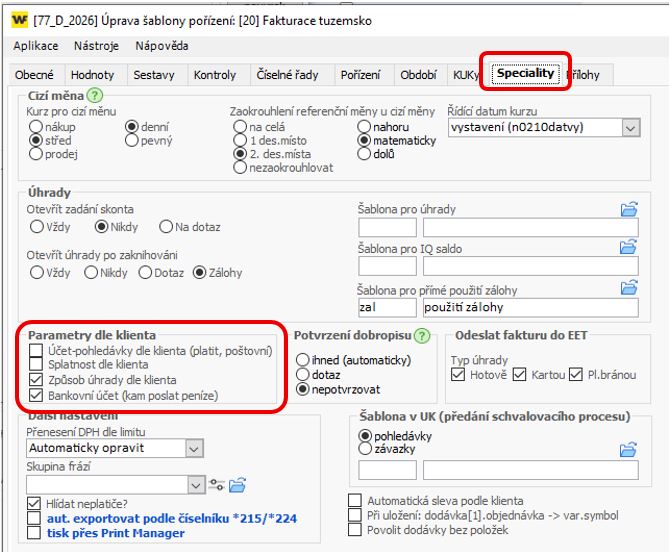 Pravým tlačítkem na šabloně pořízení Hlavičky faktury -> Šablona -> tlačítko Uprav -> na záložce Speciality -> v části Parametry dle klienta najdete možnost nastavení přebírání obchodních parametrů z klienta (*3000).