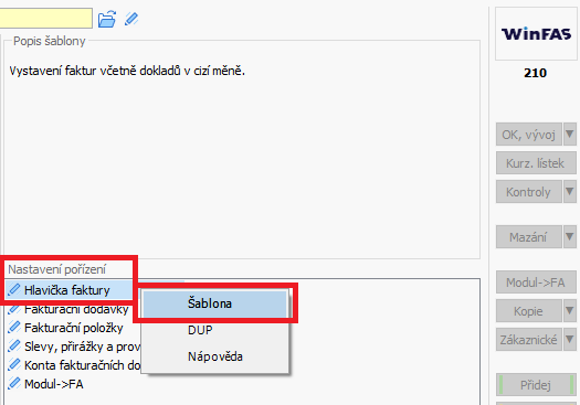 Nastavení šablony v apl. *210 Obchodník