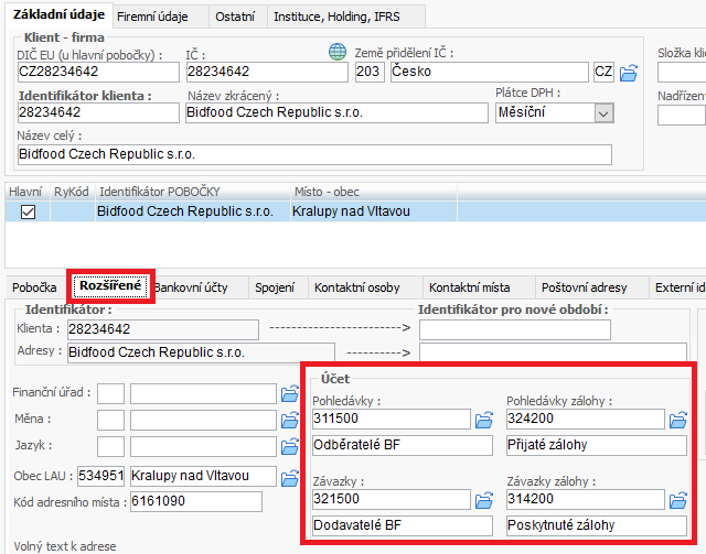 - Na vybrané pobočce klienta přejděte na záložku Rozšířené.
