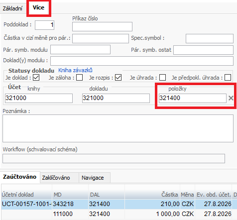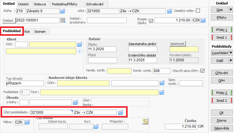 - Při pořízení závazků se tento účet zobrazí na záložce "Poddoklad".