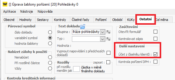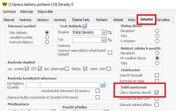 - Přejděte na záložku Ostatní a v části Parametry dle klienta zaktivněte přebírání účtu z číselníku klientů (zaškrtávátko).