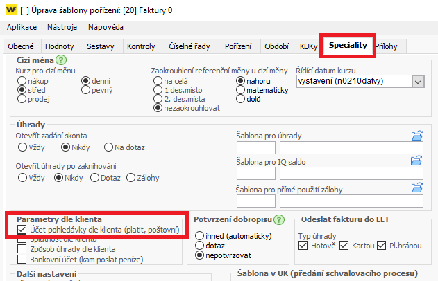 - Přejděte na záložku Speciality a v části Parametry dle klienta zaktivněte přebírání účtu dle klienta (zaškrtávátko).
