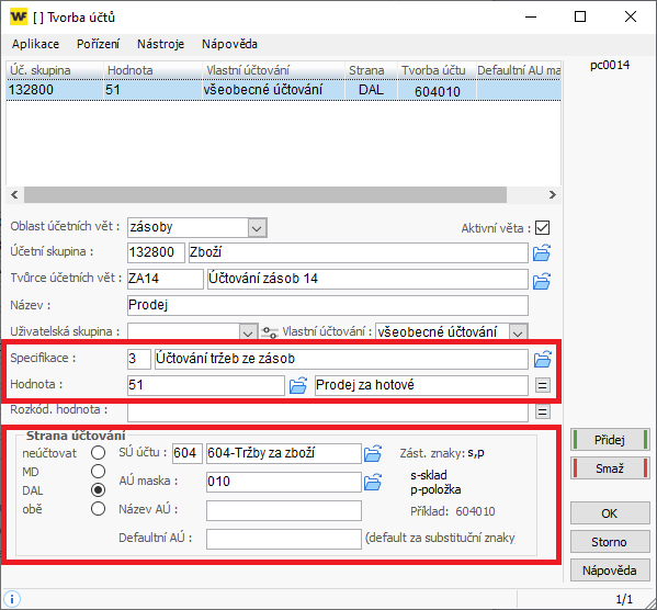 - Pokud nemáte pro pohyb prodeje za hotové (příkladem Hodnota "51") nastavenou specifikaci 3, pořiďte ji přes tlačítko Přidej dle vzoru na obrázku níže.