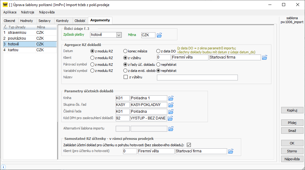 - Pro každý typ úhrady (hotově / kartou / poukázkou / stravenkou) musí být nastavený vlastní řádek s argumenty.