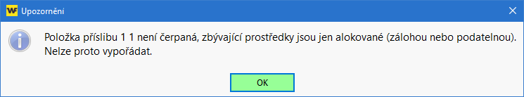 Při vypořádní položky příslibu program automaticky kontroluje zda je na příslib napojen doklad z jiného modulu/aplikace (např. Podatelna, Závazky, ...). Na tento fakt je uživatel upozorněn pomocí upozornění.