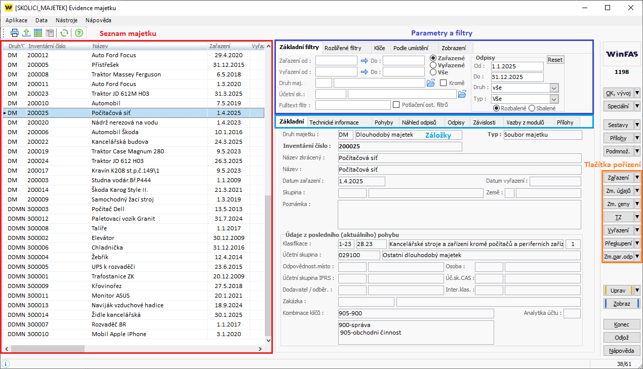 V této části okna je zobrazen veškerý majetek. U každé položky je uveden druh, inventární číslo, název, datum zařazení a pomocí posuvníku lze zobrazit i další údaje. Velmi praktické jde využití vyhledávání pomocí klávesy F3, případně výrazového filtru (rozcestník +2041 Základy ovládání).
