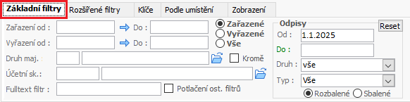 Pravá horní část okna slouží k filtrování majetku podle zadaných kritérií. Lze filtrovat pouze zařazený, vyřazený, nebo veškerý majetek. Dále můžete filtrovat podle inventárního čísla nebo názvu (pole fulltext filtr), druhu majetku, účetní skupiny nebo uživatelsky definované skupiny majetku.