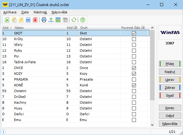 • sloupec Povinné číslo ÚE - označuje druhy (skupiny) s povinností přiřazovat k pohybům konkrétní čísla zvířat.