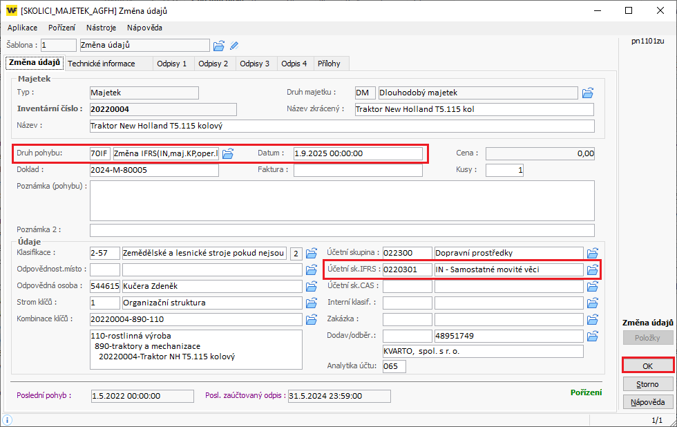 - Pohyb – speciální pohyb 70IF – Změna IFRS (IN, majetek k prodeji).