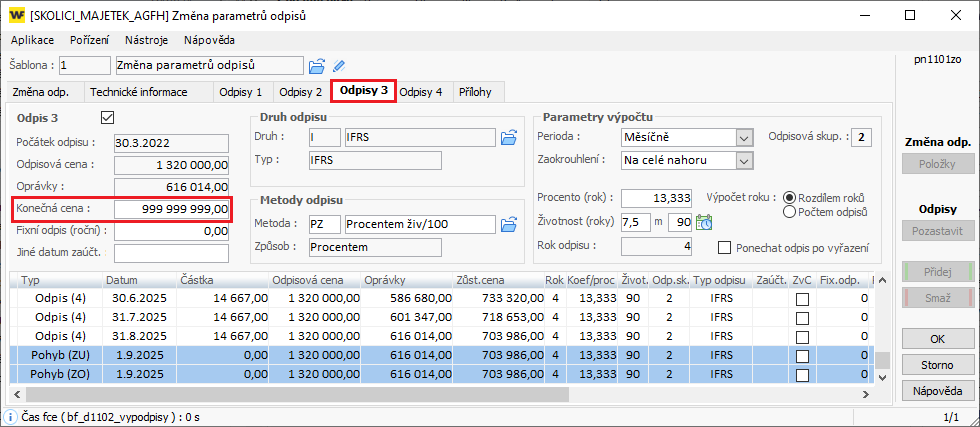 - Stiskněte tlačítko „Zm.par.odp“ (změna parametrů odpisu) v pravé části okna.