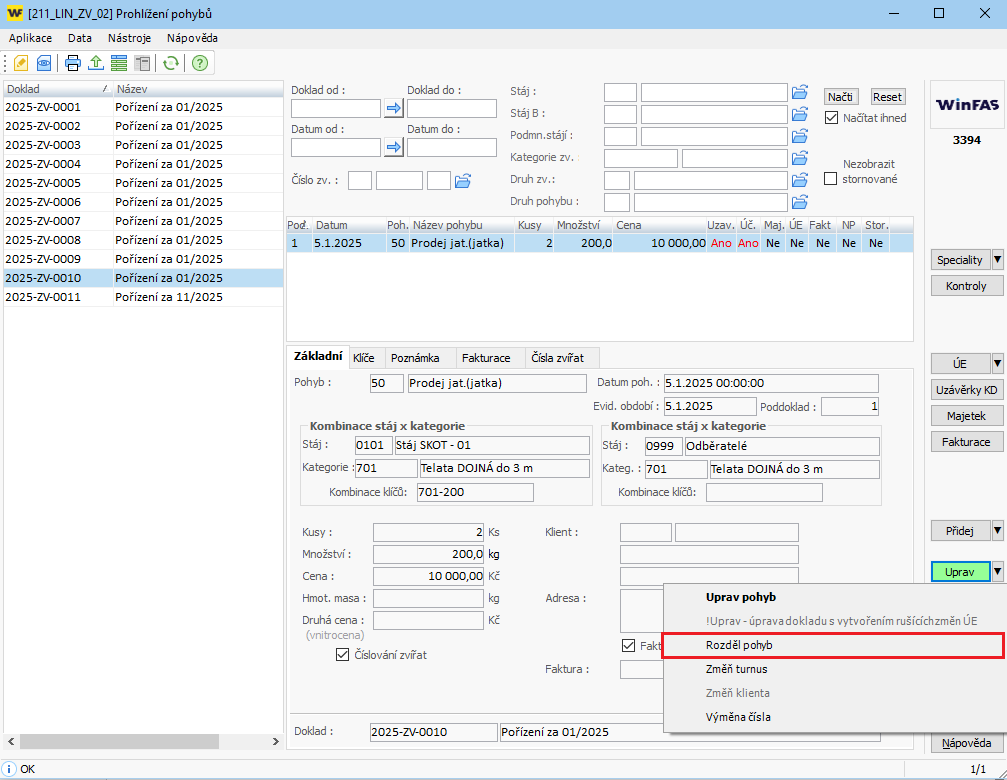 Funkce umožňuje rozdělovat poddoklady (pohyby) evidence zvířat bez nutnosti rušit jakékoliv předání dat.
