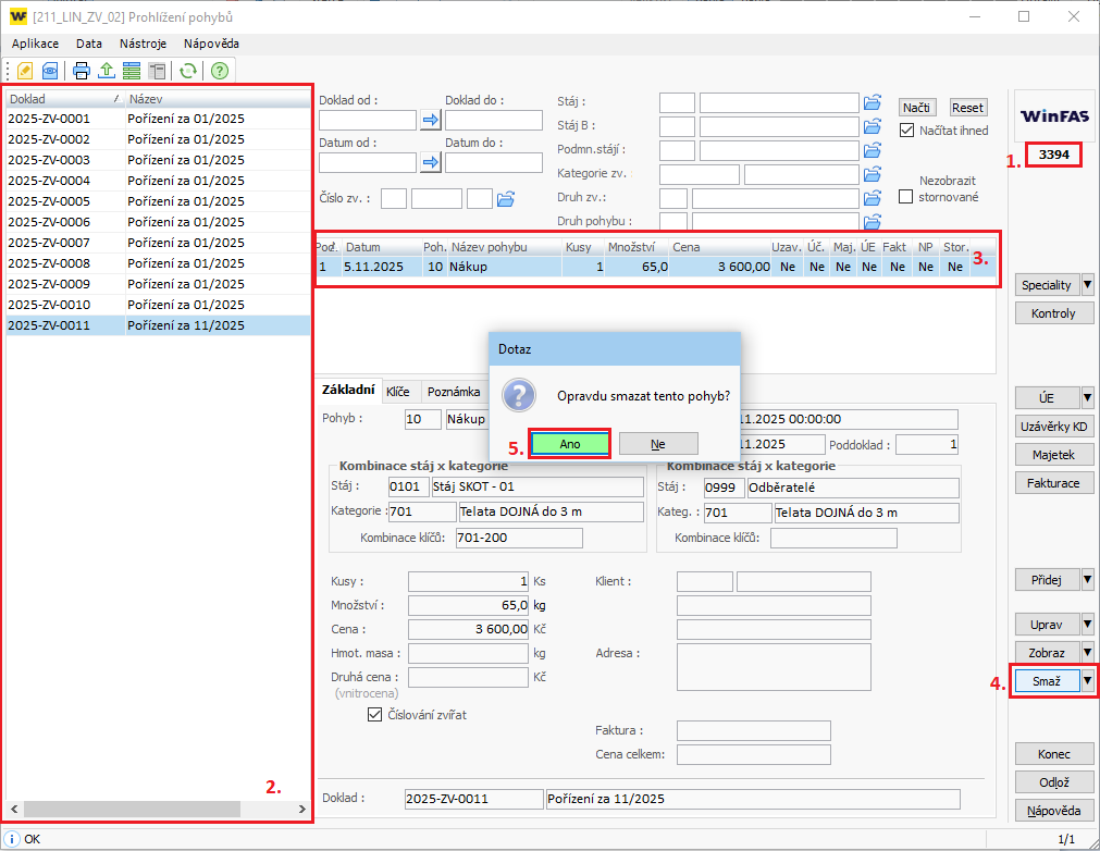 - 2. Označte doklad, na kterém se hledaný pohyb nachází (pro snadnější vyhledání můžete použít filtry, např. datum, druh pohybu, stáj,...).