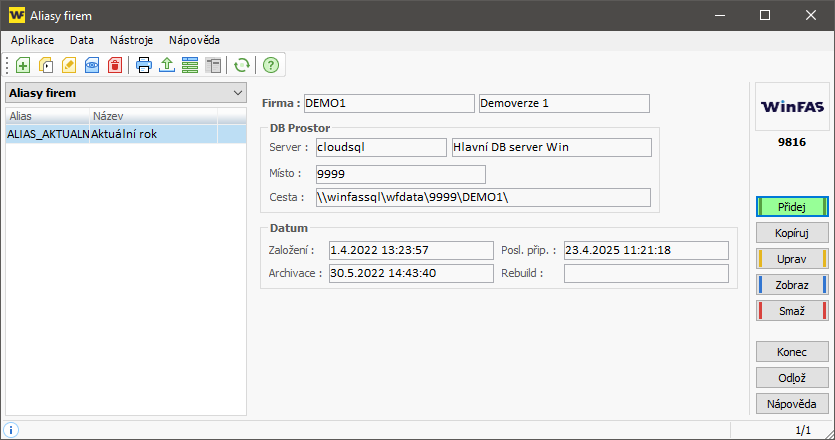 - Spusťte aplikaci *9816 Aliasy firem