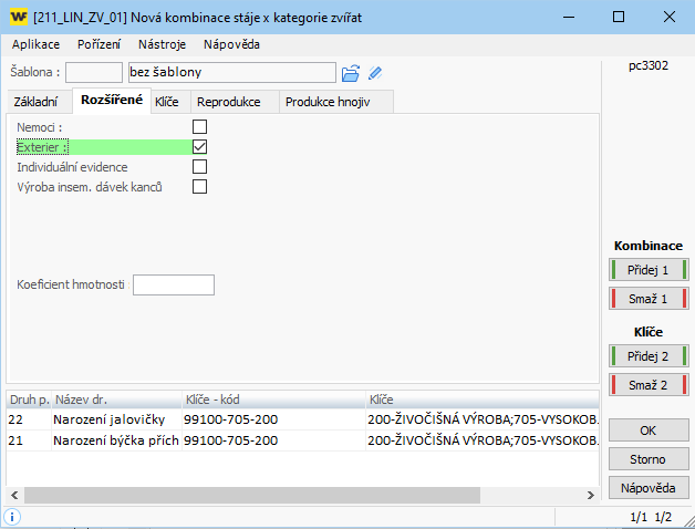 - 1. Otevřete aplikaci *3302 Číselník kombinací stáj x kategorie zv.
