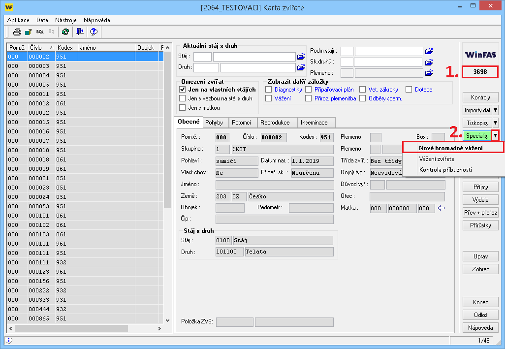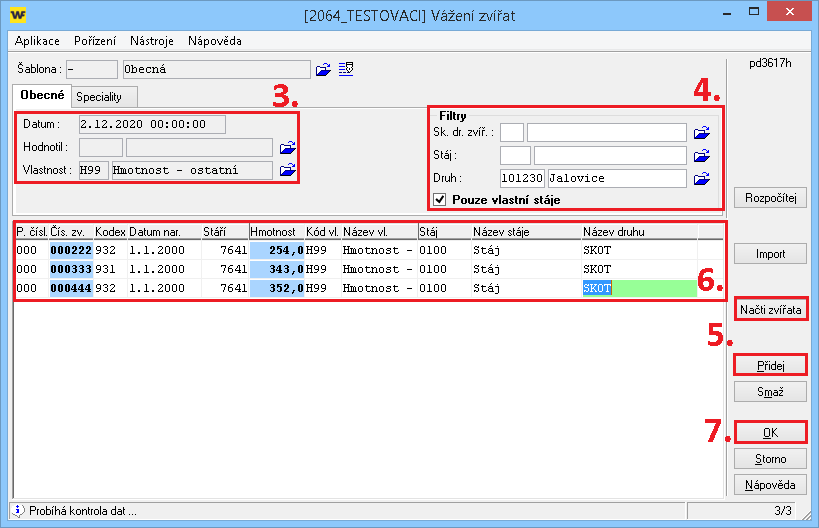 • 6. Do vytvořeného řádku zadejte číslo zvířete a jeho naváženou hmotnost.