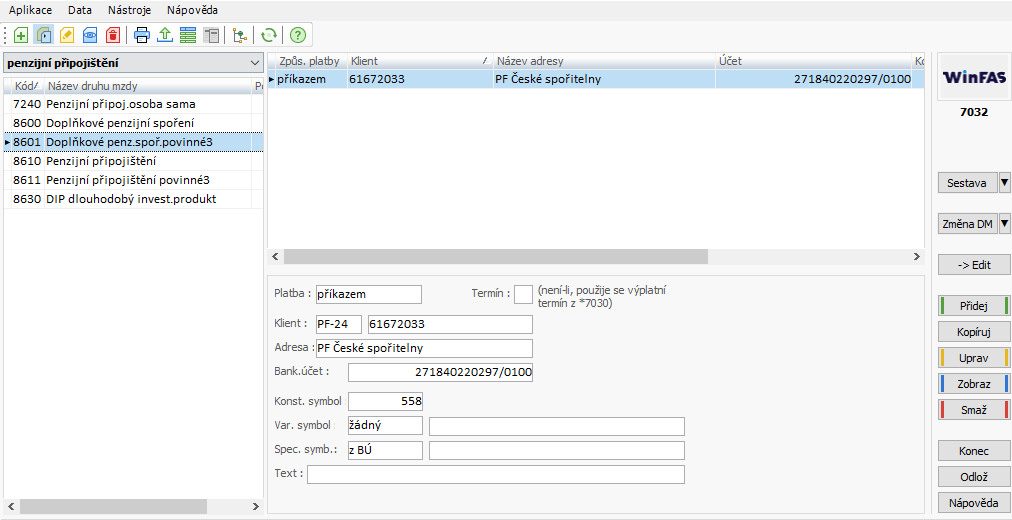 V *7032 Parametry plateb v oblasti Penzijní připojištění přidejte k novým druhům 8601, 8611 potřebné společné parametry pro penzijní společnosti, nejlépe zkopírováním z již existujících druhů 8600, 8610.