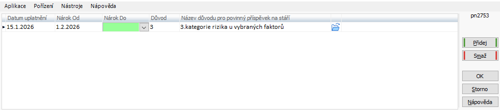 Pokud zaměstnanec v daném pracovněprávním vztahu (PPV) vykonává vybrané rizikové práce dle zákona, uveďte tuto skutečnost k jeho jednotlivým PPV v *7011. Klepnutím na ikonu u údaje se otevře pořízení, kde uvedete období, ve kterém zam-ec v tomto PPV vykonává uvedené rizikové práce včetně data, kdy nárok na příspěvek uplatnil. Pouze u PPV, kde je nárok v měsíci zpracování takto zadán, se bude zaměstnanci povinný příspěvek počítat.