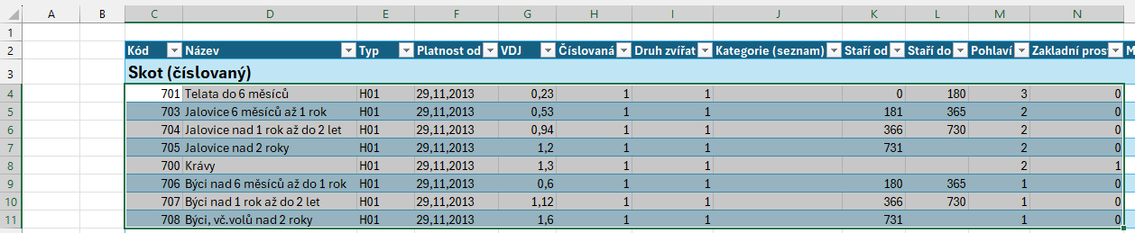 V přiloženém excelu, který naleznete zde (+3728), vyberte kategorie, které chcete naimportovat, např. Skot (číslovaný) a zkopírujte Ctrl+C.