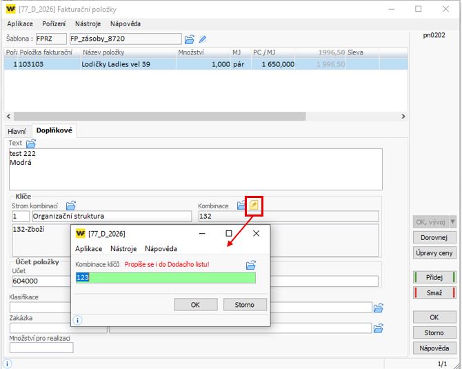 Pokud pořídíte fakturu z dodacího listu ze zásob, pak údaj pro kombinaci klíčů nelze přepsat ani na jednom z dokladů. Důvodem je udržení jednotnosti napříč oběma doklady. Zakázané údaje ze zásob najdete v návodu +3591.