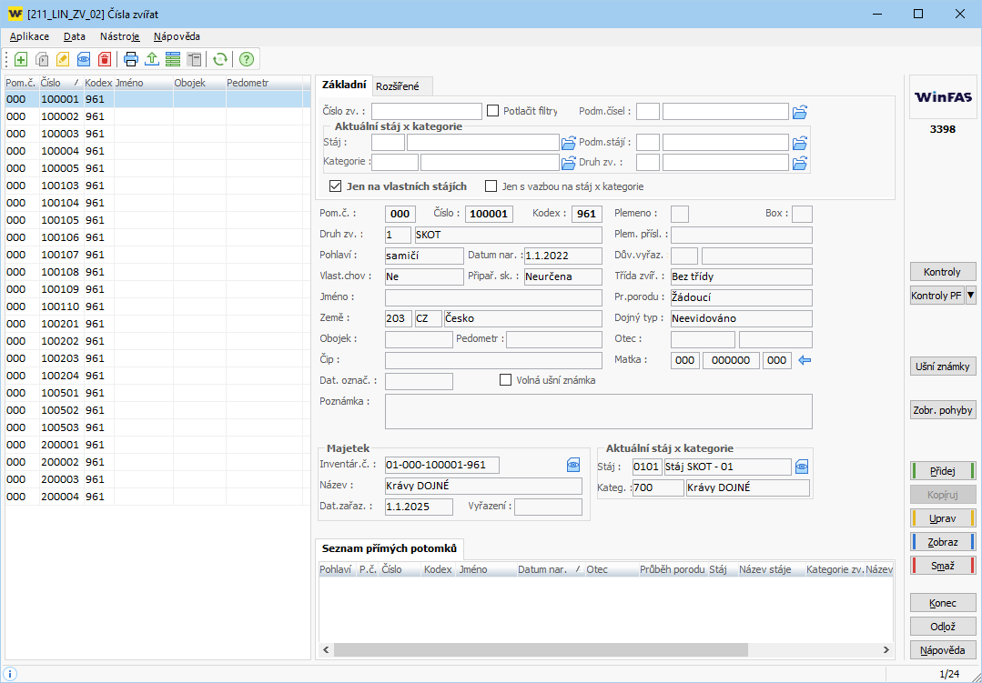 Obsahuje funkce pro přidávání nových a úpravu hodnot současných zvířat. Navíc aplikace obsahuje kontroly na jednotlivé vazby a aktualizace čísel dle ÚE.