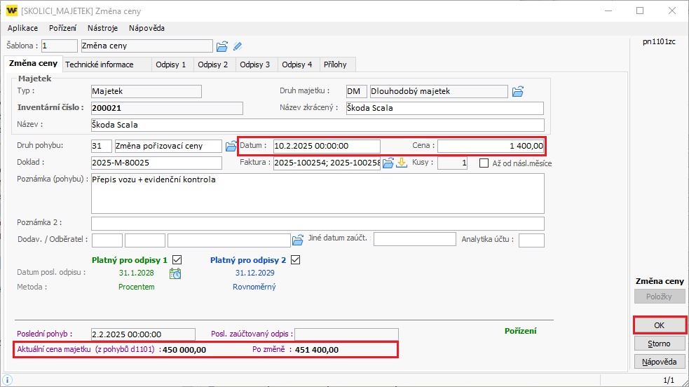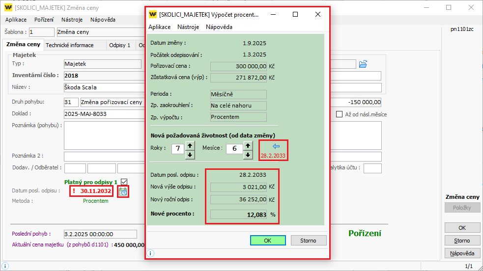 Poznámka: Pokud vlivem změny ceny dojde ke změně data posledního odpisu, systém na tuto skutečnost upozorní podbarvením a zvýrazněním tohoto data (pouze u neodepsaného majetku). V rámci pohybu je možné podle potřeby rovnou upravit parametr odpisu (životnost, procento odpisu). Stačí kliknout na ikonu odpisové kalkulačky vedle pole Datum posl. odpisu. Následně můžete převzít původní datum odpisu, čímž se automaticky upraví parametry odpisů a tím i samotná výše odpisů.