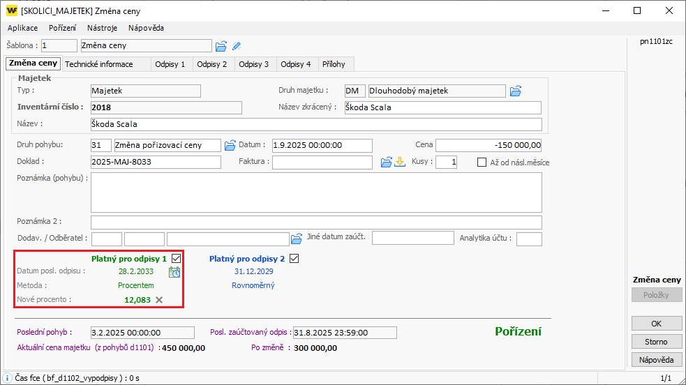 - Odpisy se automaticky přepočítají podle nové vstupní ceny a platných koeficientů.