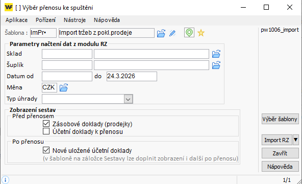 Tento návod popisuje pouze postup spuštění importu prodejek ze zásob do účetnictví. Nastavení šablon importu je popsané v návodu +3370.