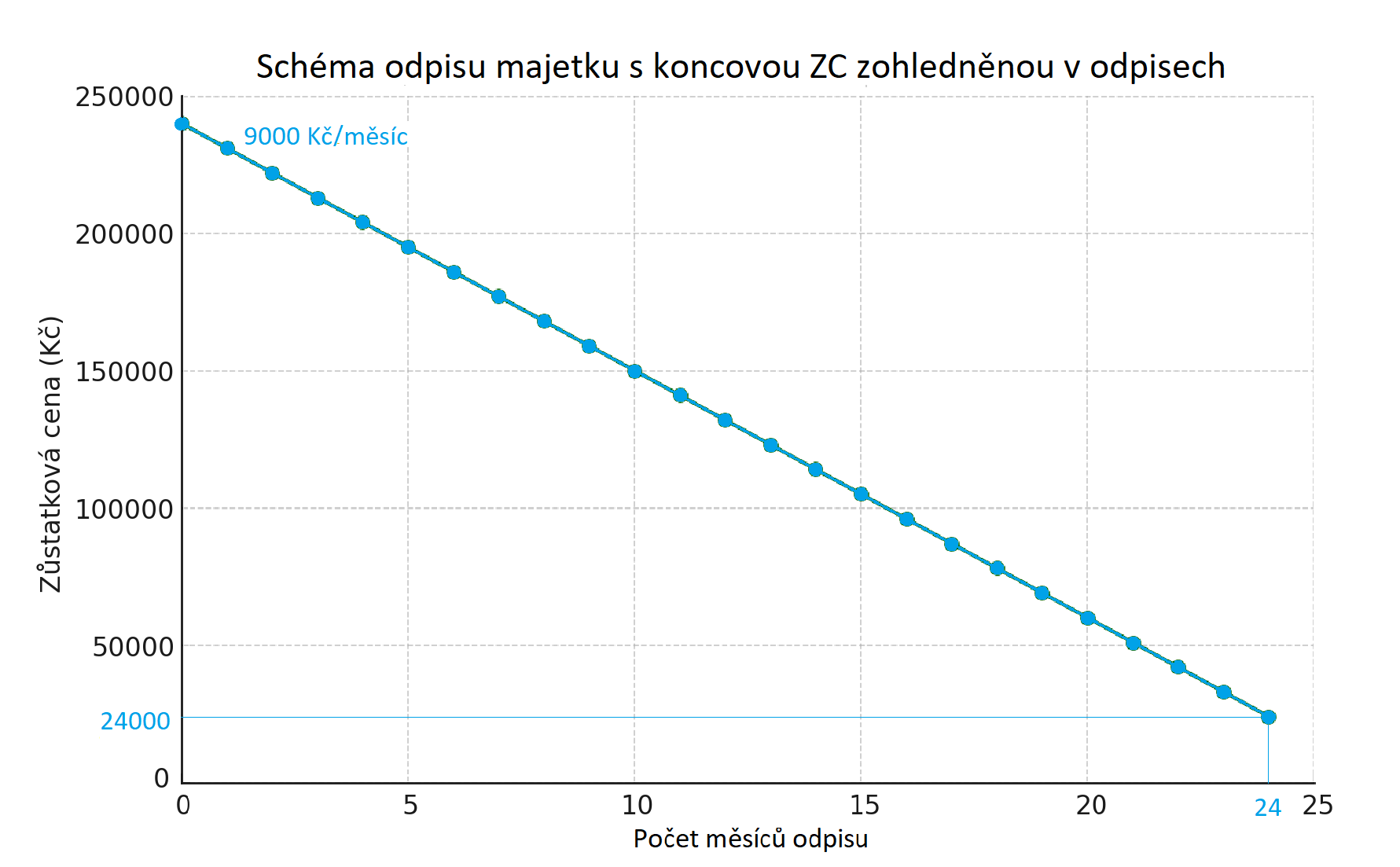 Příklad 3: Majetek s pořizovací cenou 240 000 Kč má životnost 24 měsíců. Koncová ZC je ve výši 24 000 Kč a je zahrnuta do výše odpisů, tzn. měsíční odpis činí 9 000 Kč při zachování životnosti 24 měsíců. Majetek s pořizovací cenou 240 000 Kč má životnost 24 měsíců. Stanovená koncová ZC je 24 000 Kč, která je zohledněna při výpočtu odpisů. Měsíční odpis tedy činí 9 000 Kč, přičemž se odepisuje po celou dobu životnosti (24 měsíců).
