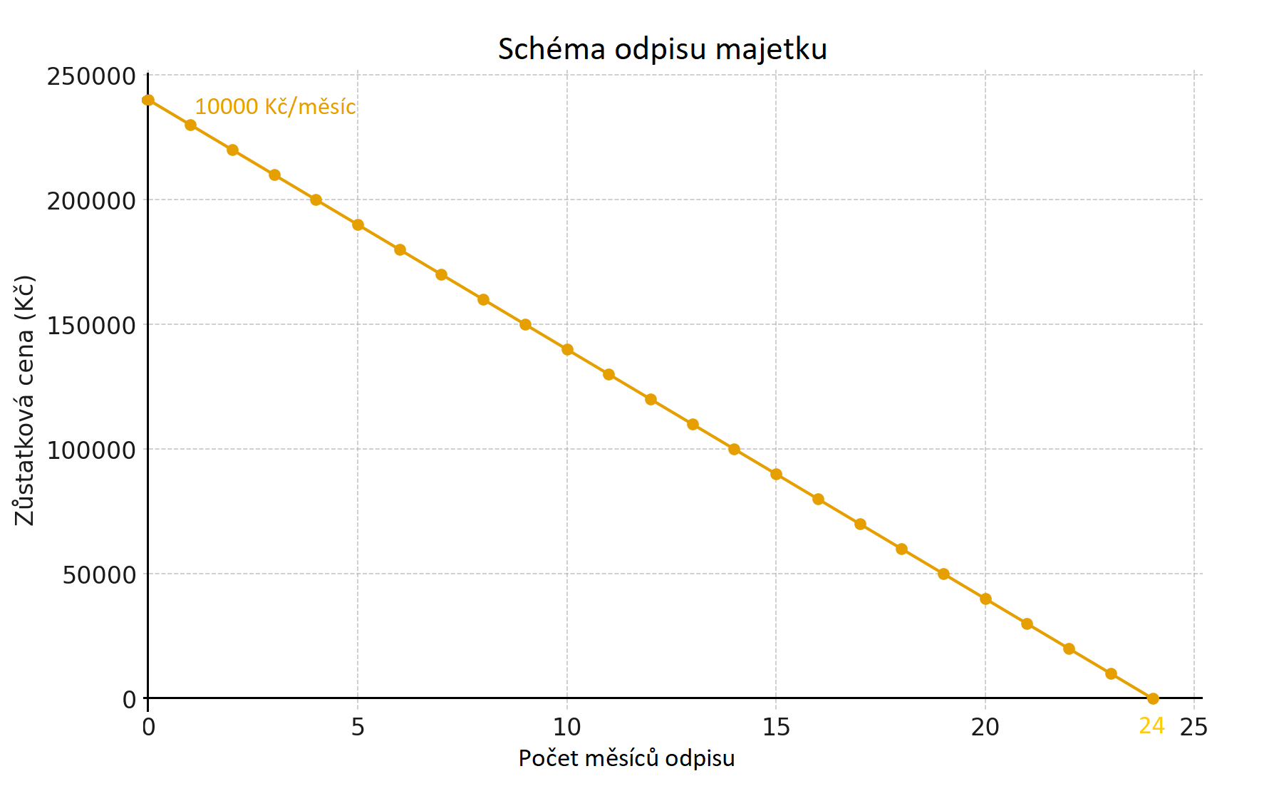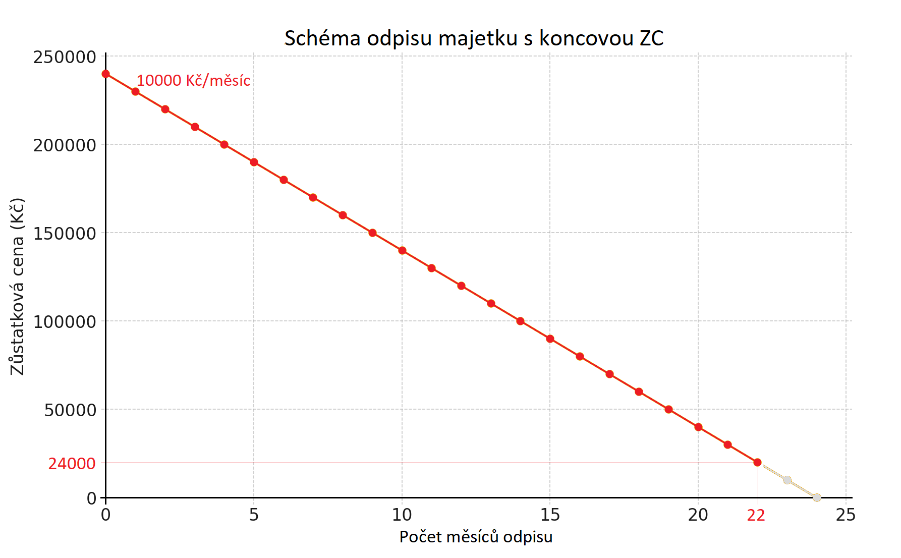 Příklad 1: Majetek s pořizovací cenou 240 000 Kč má životnost 24 měsíců. Měsíční odpis činí 10 000 Kč. Koncová ZC není stanovena, majetek se tedy odepisuje až do nulové hodnoty.