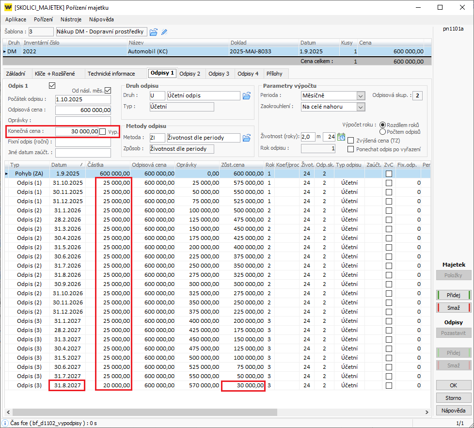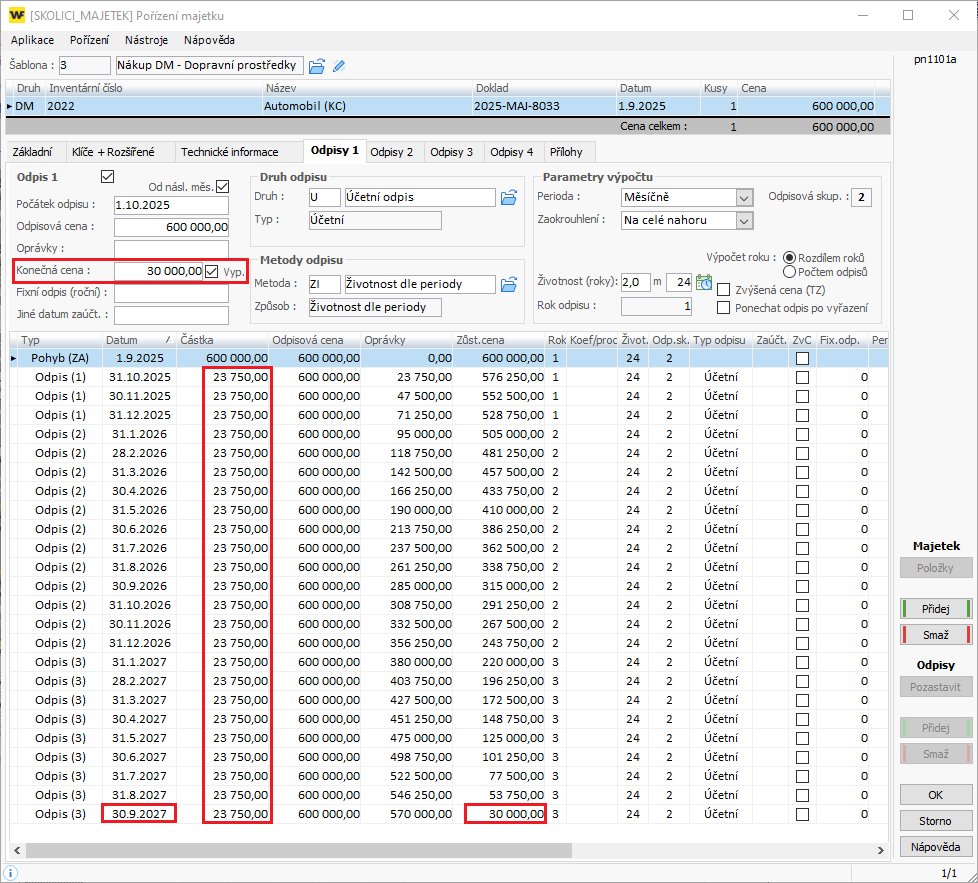Příklad: Majetek s pořizovací cenou 600 000 Kč je odepisován od 1. 10. 2025 po dobu 24 měsíců, tzn. původní měsíční odpis je 25 000 Kč a poslední odpis připadá na 30. 9. 2027. Pokud zadám zůstatkovou cenu 30 000 Kč a zatrhnu pole pro zohlednění konečné ceny, měsíční odpis se přepočítá na 23 750 Kč ((600 000 – 30 000)/24