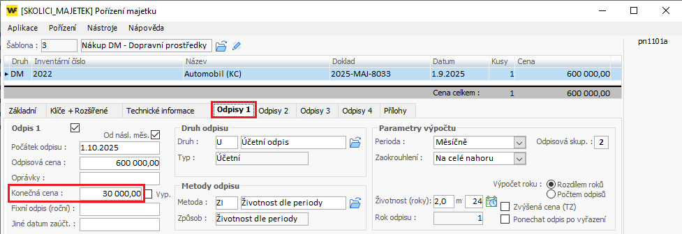 - Odpisová cena se pro účely výpočtu odpisů sníží o zadanou konečnou cenu.
