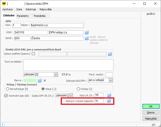 - Na záložce Základní nastavte kód pro vrácení odpočtu (viz příklad na obrázku)
