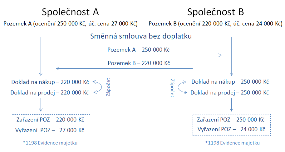 Společnost A a společnost B směňují dva pozemky. Zůstatková hodnota pozemku ve společnosti A je 27 000 Kč, ocenění (např. znaleckým posudkem) pozemku ve společnosti A je 250 000 Kč, ocenění pozemku ve společnosti B je 220 000 Kč.