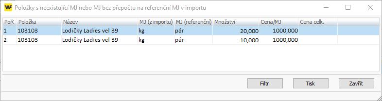 - Otevře se okno "Položky s neexistující MJ nebo MJ bez přepočtu na referenční MJ v importu"