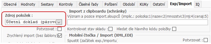- Provedete na záložce Exp/Import - v části Zdroj položek vyberte Účetní doklad (párování)