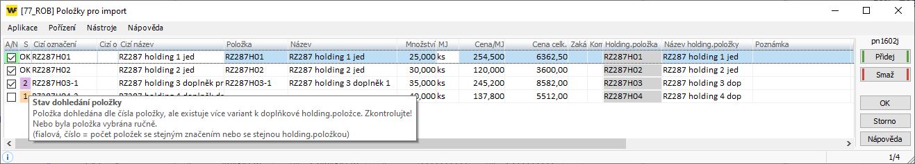 - Fialová hodnota - doplňková holdingová položka, která v databázi existuje včetně čísla doplňku. Je nutné, aby uživatel zkontrolvoal, že jde o správnou položku, protože doplňky se mohou na jednotlivých firmách lišit.