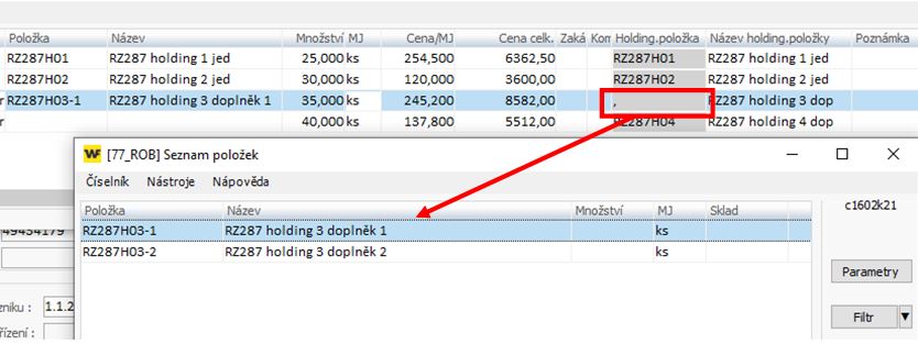 Výběr doplňkové holdingové položky provedete nejlépe ve sloupci "Holding. položka".