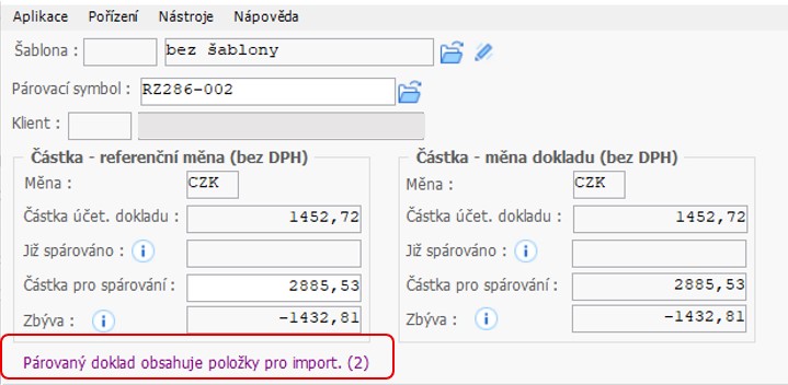 - Po potvrzení a odsouhlasení částek párování postupujeme stejně jako u jiných importů položek - viz. návod +3443.