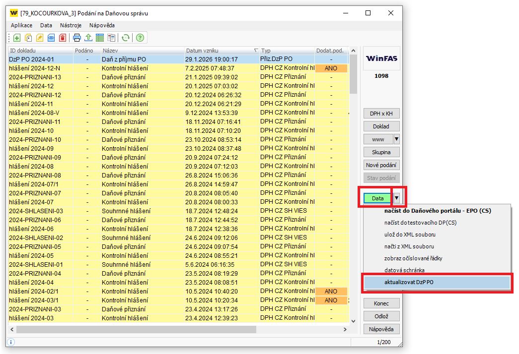 V 1. kroku WinFAS generuje pouze výkazy (návod +1624) ty nahrajete do potálu Mojedane.cz a vyplníte přiznání.