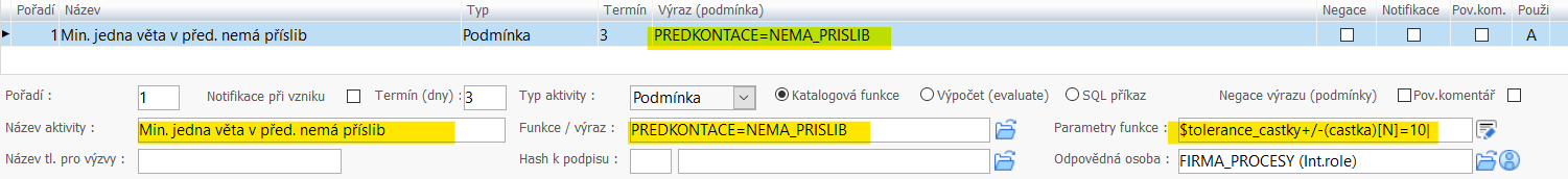 U těchto podmínek lze zadat toleranci v případě, že nechceme řešit haléřové či korunové rozdíly oproti schválenému Příslibu. Toleranci je nutné nastavit v Parametrech funkce v Kč, vždy u obou podmínek. Zde je příklad tolerance 10 Kč oproti schválenému Příslibu.