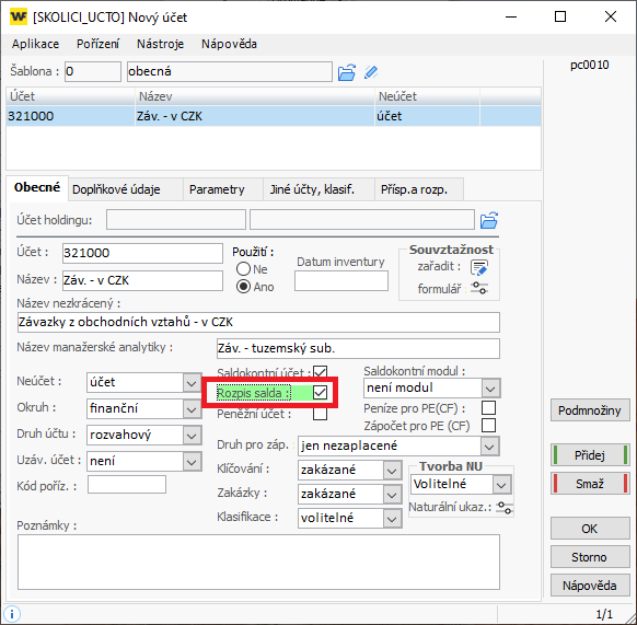 - Nastavení stejné jako u předkontace -> saldo-rozpis
