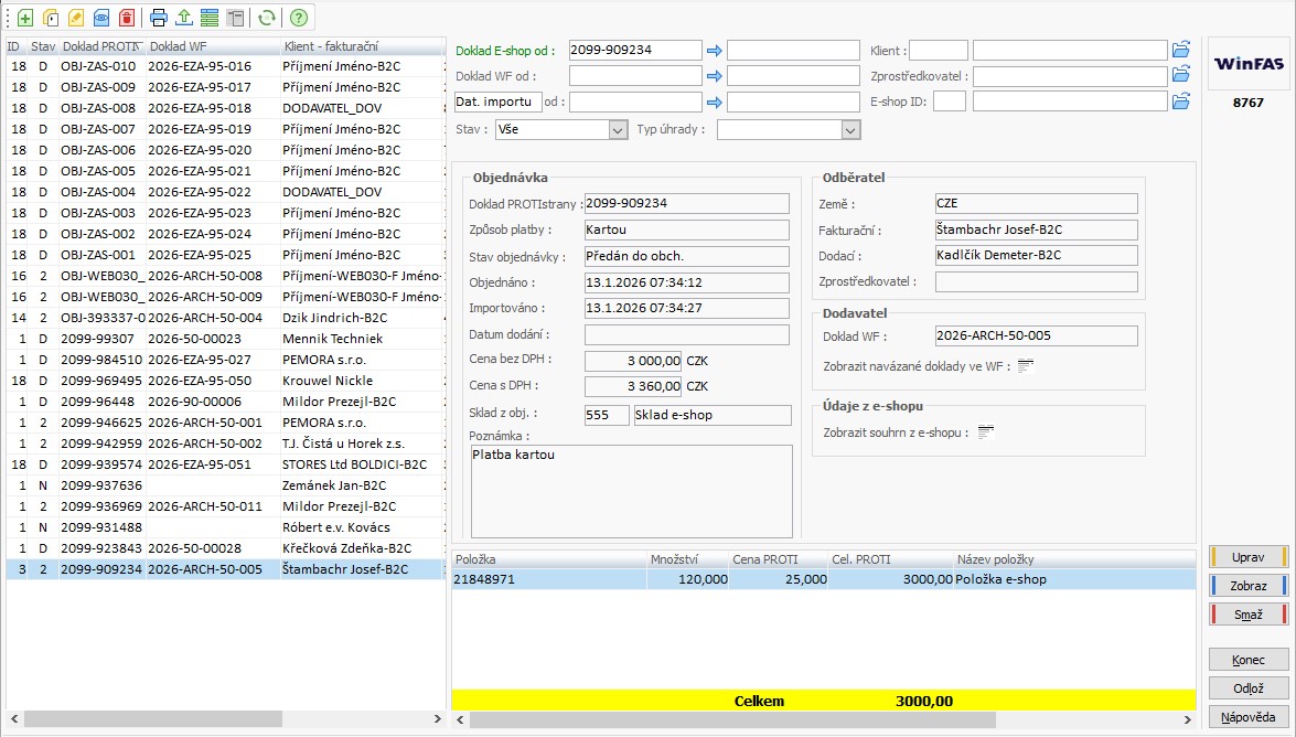 V levé části aplikace se nachází seznam e-shopových objednávek. Pravá část zajišťuje filtraci a zobrazuje detailní údaje objednávky.