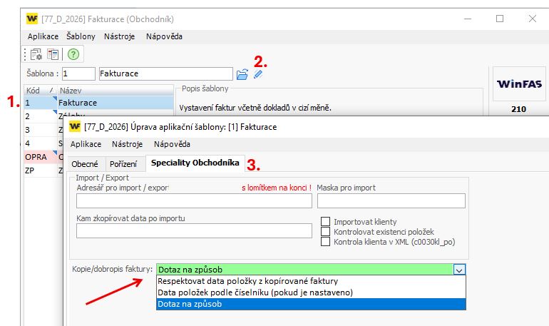 - Nastavení provedete na aplikační šabloně (1.,2.) v *210 Fakturace - záložka Speciality Obchodníka (3.):