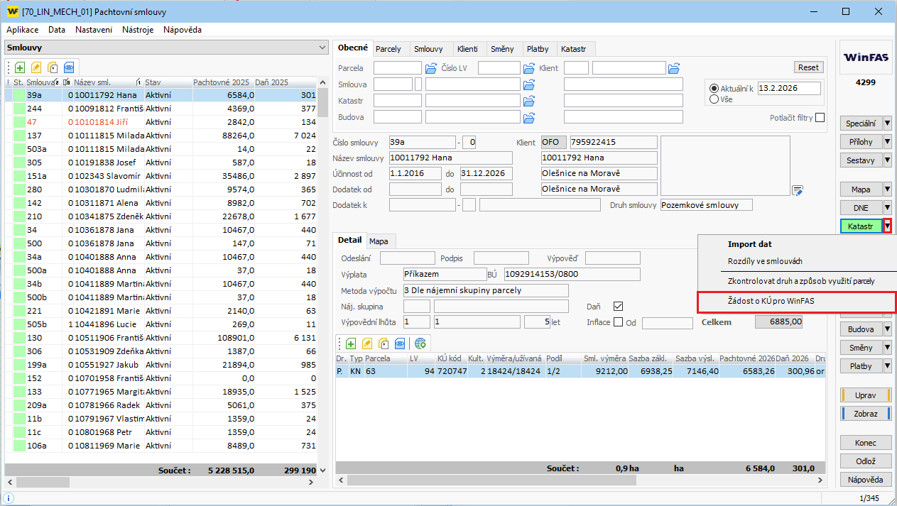 - Vytvoření a odeslání žádosti s rozsahem požadovaných katastrů pro WinFAS.