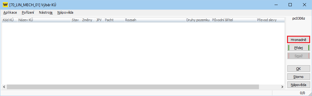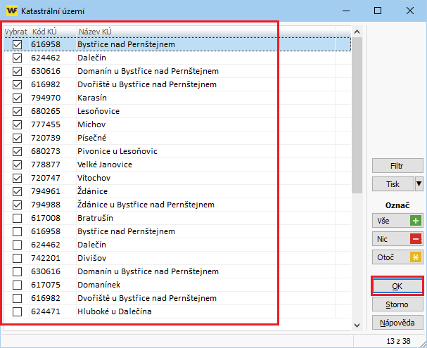 4. Otevře se okno pro výběr katastrů, kde pomocí tlačítka „Hromadně“ klient provede výběr katastrů, které požaduje aktualizovat a uloží tlačítkem OK.