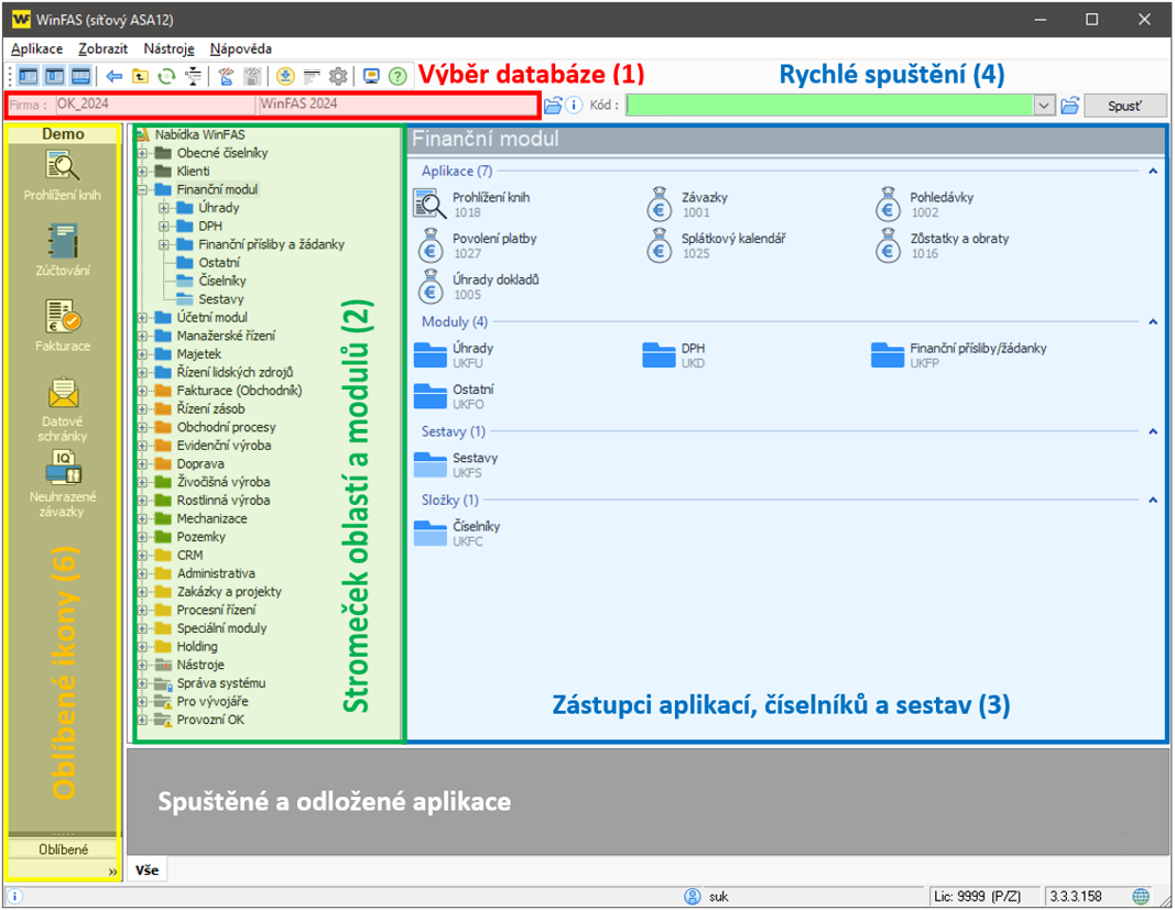 Jde o první okno, které se zobrazí po spuštení WinFASu. Slouží především jako rozcestník ke spouštění jednotlivých číselníků, aplikací a sestav. Mimo to umožňuje výběr zpracovávaného roku, firemní databáze (pokud na počítači zpracováváte více firem), přepínání mezi spuštenými aplikacemi, ruční archivace, aktualizaci programu a další. Podrobný seznam všech funkcí najdete na konci tohoto návodu.