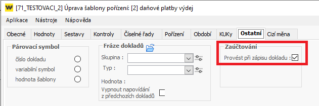 - Vybrané zaškrtávátko - aktivní účtování dokladu